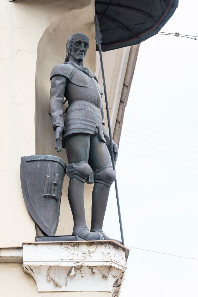 Todėl mieliau rinkosi dekoratyvinę skulptūrą, jautė polinkį tautinei romantizuotai istorijai. Trauks senovės kario ginklų, riterių šarvų grožis. Diplominiam darbui sumanys išdrožti medinį istorinio miesto sargybinį su skydu. Tema tiks Vilniaus 650 metų jubiliejui, bet ne tuometei valdžiai. Jauno skulptoriaus idėją pavyks apginti studentus visada užtardavusiam diplominio darbo vadovui prof. G. Jokūboniui. Varinę kūrinio kopiją padarys meistras V. Navickas. „Vartų sargybinis“ atsistos Trakų g. 2 / Pylimo g. 24 namo nišoje. Tiesa, tada dar be Gedimino stulpų skyde – juos iškals vėliau.